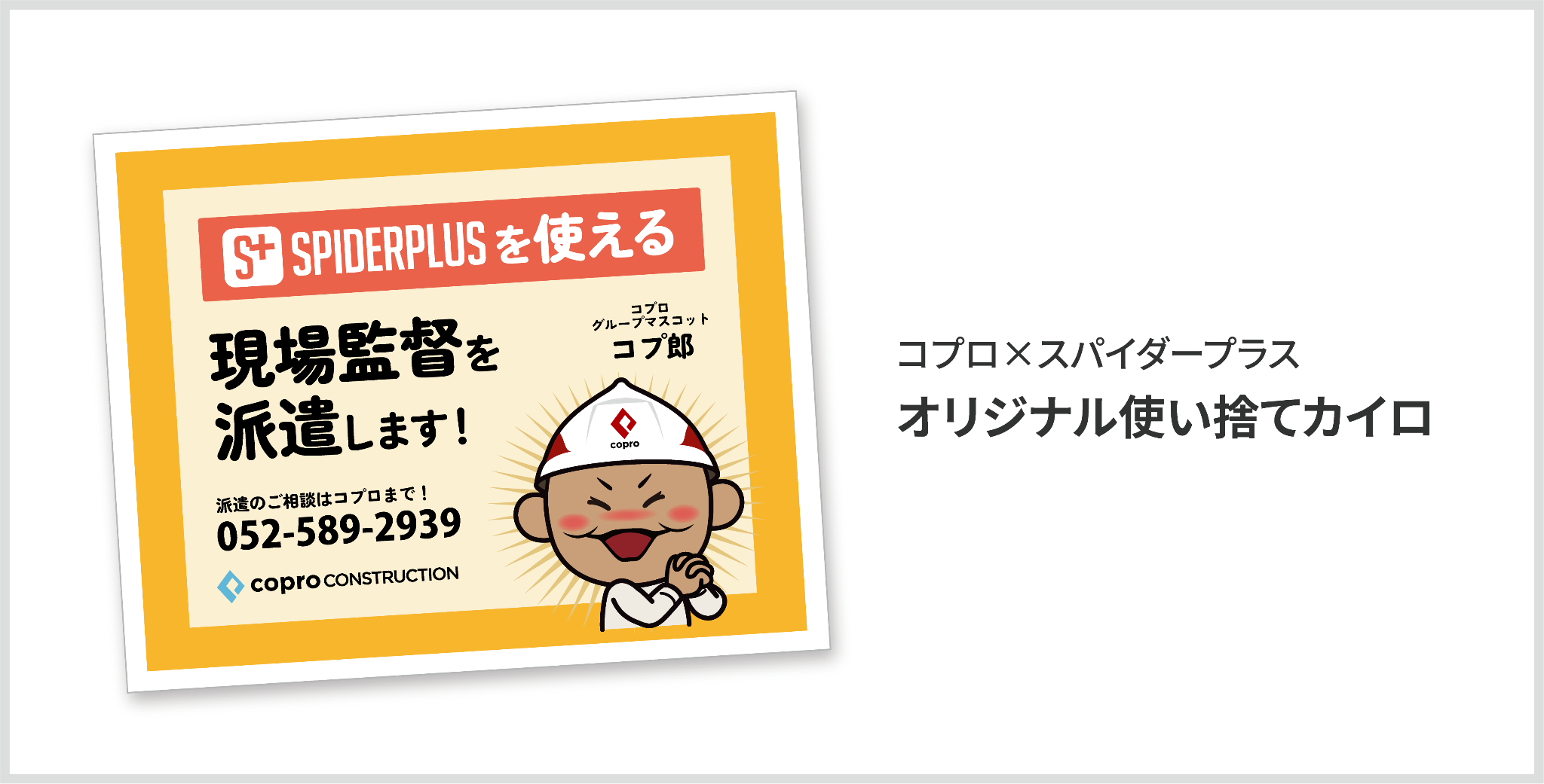 ブースにお越しいただいた先着1,200名様に、コプロ×スパイダープラスオリジナル使い捨てカイロをプレゼントいたします。今回の共同ブース限定のグッズをご来場の記念に、ぜひお受けとりください。